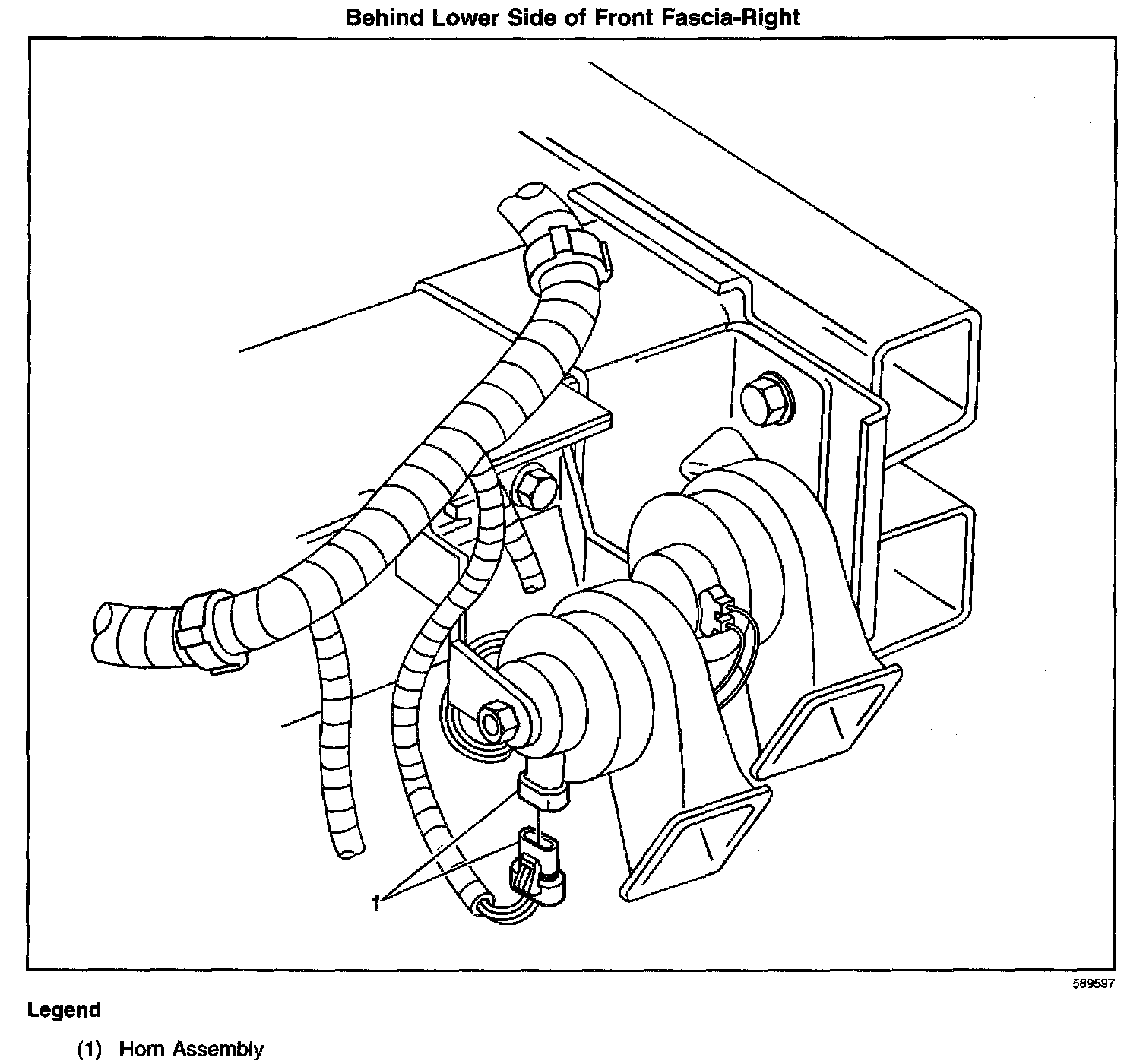 Behind the front fascia, mounted to the frame rail extension, below the right headlamp