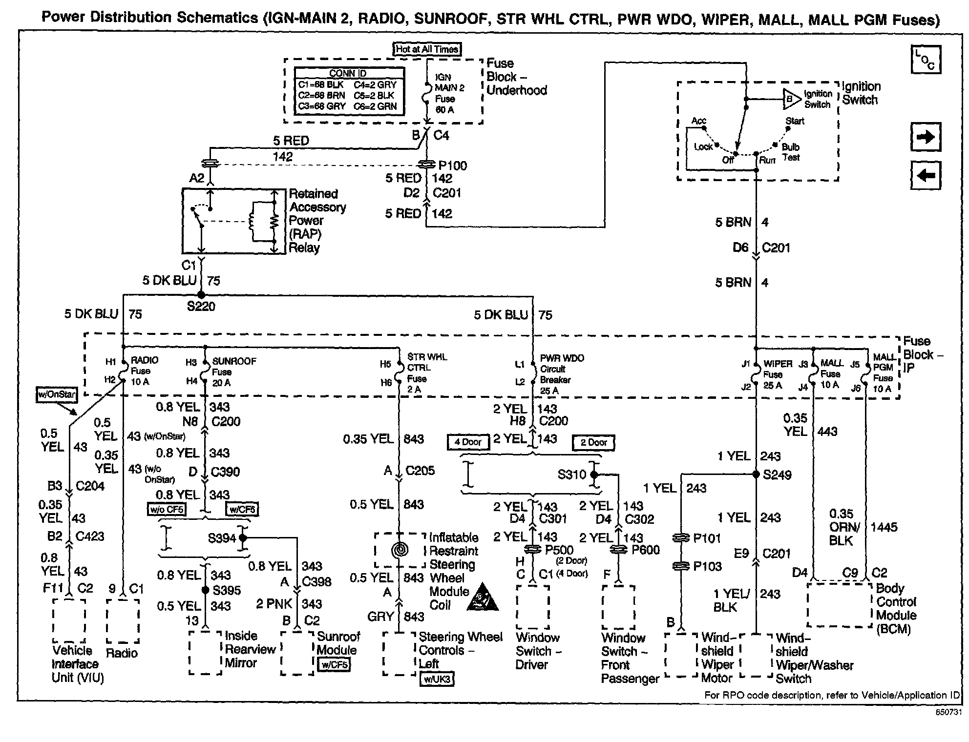 Power Distribution Schematics: IGN-MAIN 2, RADIO, SUNROOF, STR WHL CTRL, PWR WDO, WIPER, MALL, MALL PGM Fuses: