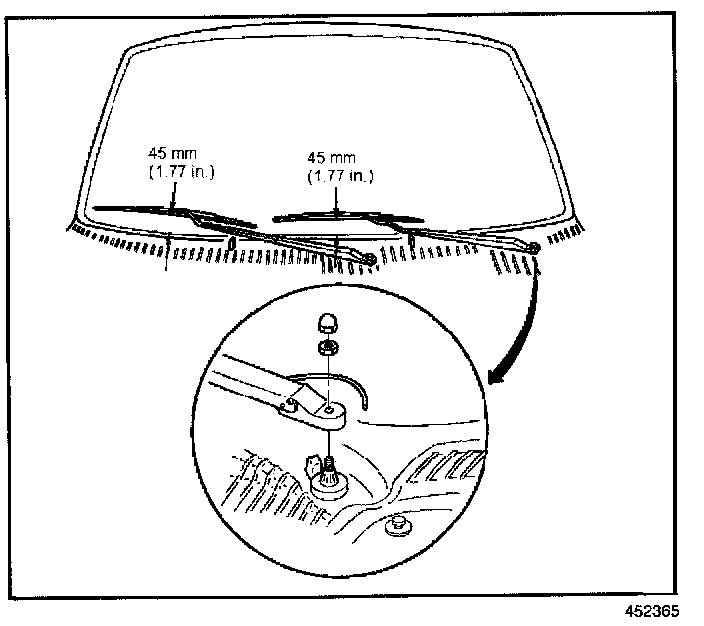 1. Install the wiper arm onto the wiper transmission drive shaft while maintaining a distance of 45 mm (1.77 in) between the wiper blade and the bottom of the windshield.