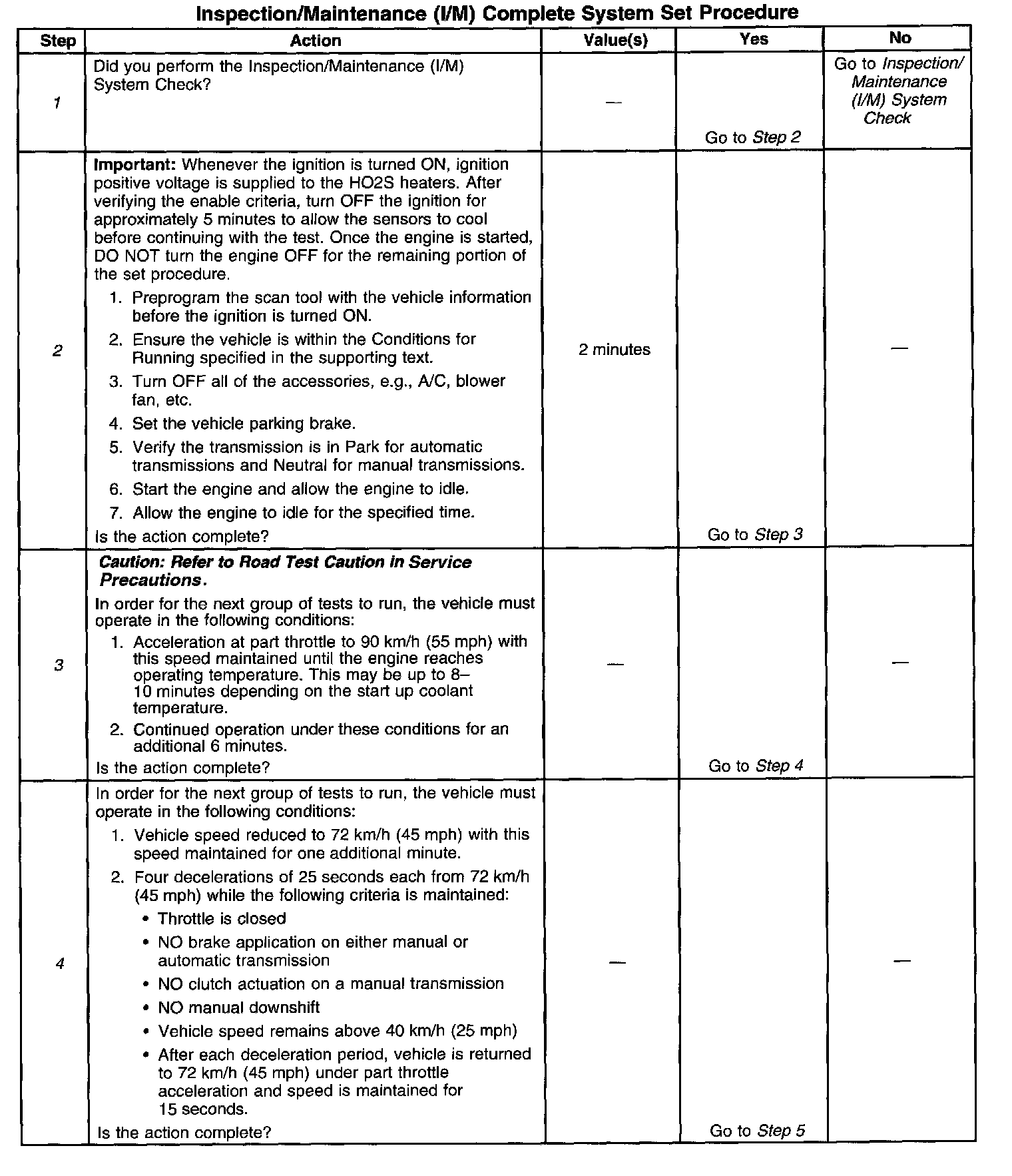 DESCRIPTIONThe purpose of the I/M Complete System Set Procedure is to satisfy the enable criteria necessary to execute all of the I/M readiness diagnostics, and complete the trips for those particular diagnostics When all diagnostic tests are completed the I/M system status indicators are set to YES. Perform this test when more than one or all of the I/M system status indicators are set to NO.