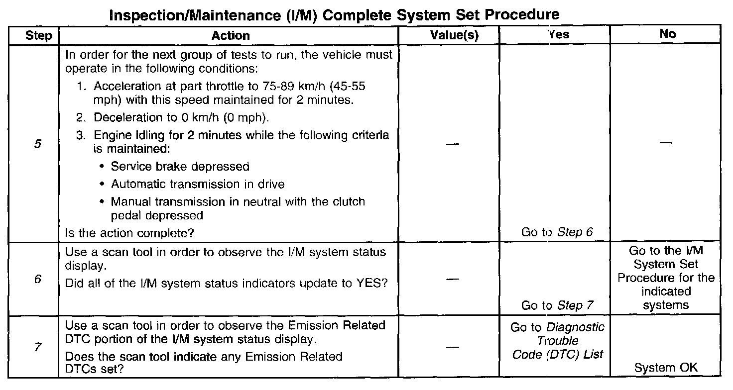 7. The I/M system status only reports on whether or not a diagnostic has run, not what the outcome of the test was. If any emission related DTC sets after the tests are complete, the DTC will require diagnosis