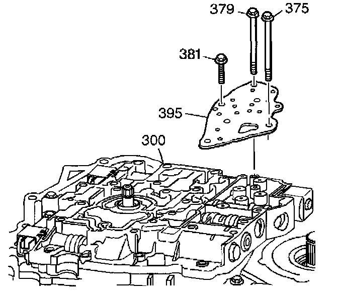 3. Remove the control valve body bolts (375, 379 and 381) that mount the fluid pressure manual valve position switch to the control valve body (300).
