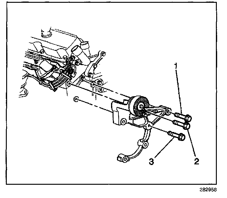 8. Remove the A/C compressor bracket bolts from the bracket (2, 3).