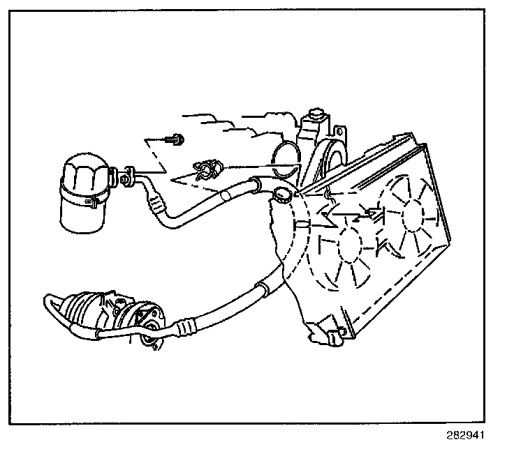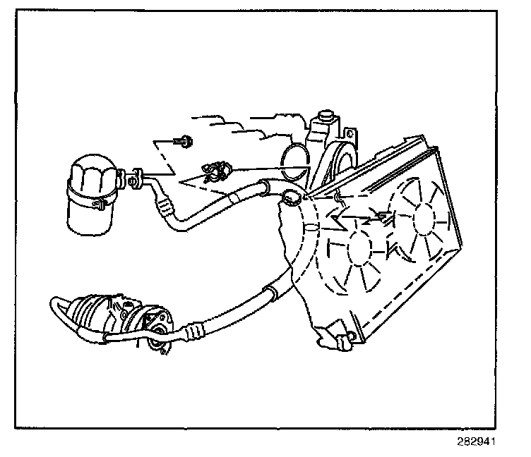 2. Remove the A/C compressor hose assembly from the fan shroud clips.