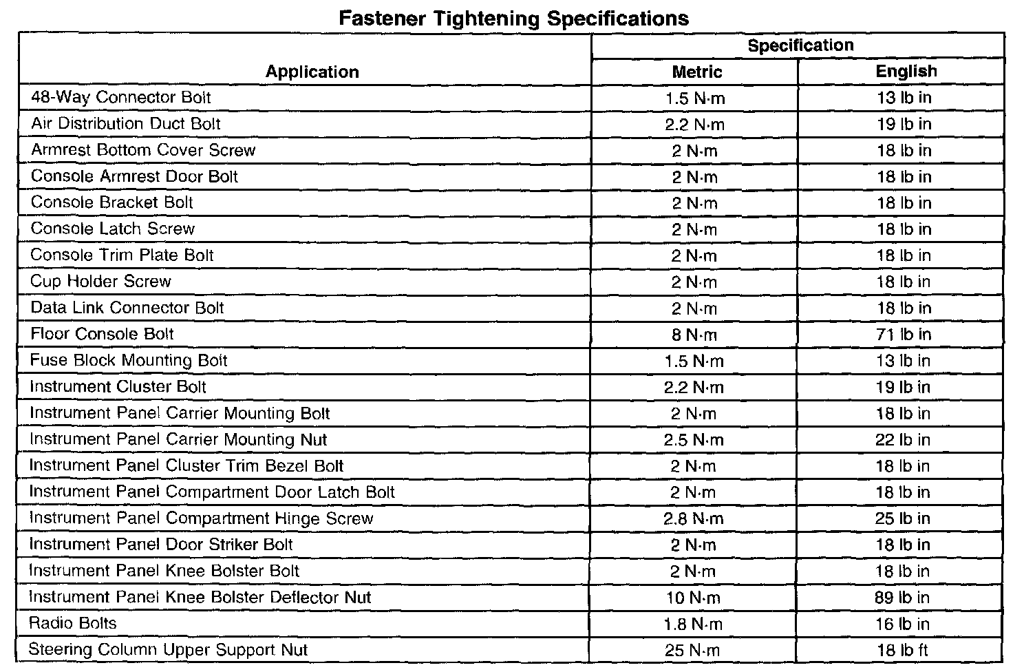 Fastener Tightening Specifications: