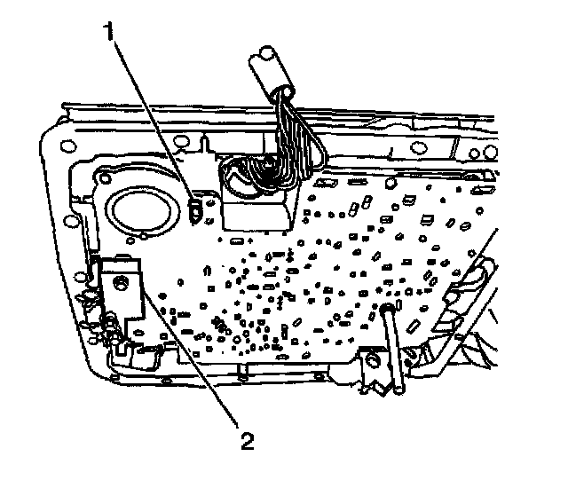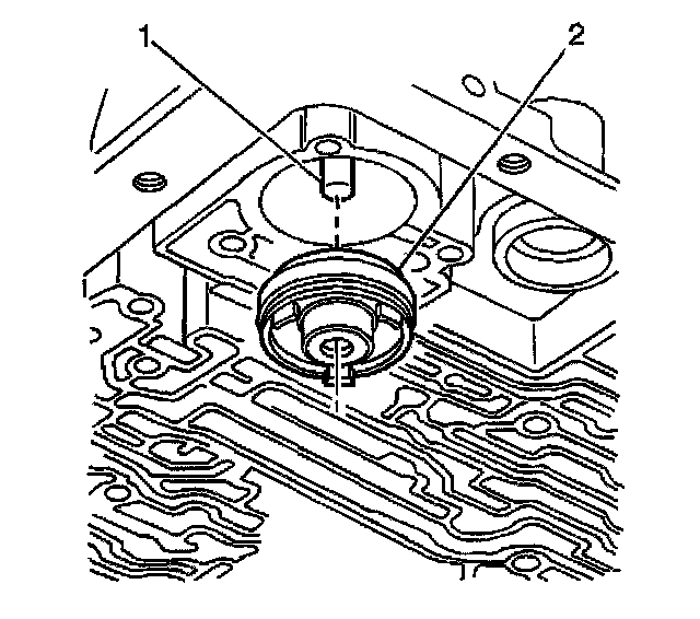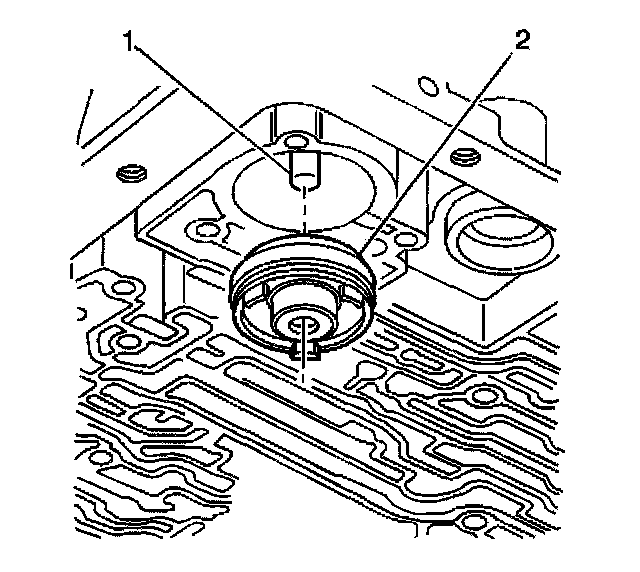 3. Install the 3-4 accumulator piston (2) onto the pin (1) in the transmission case.