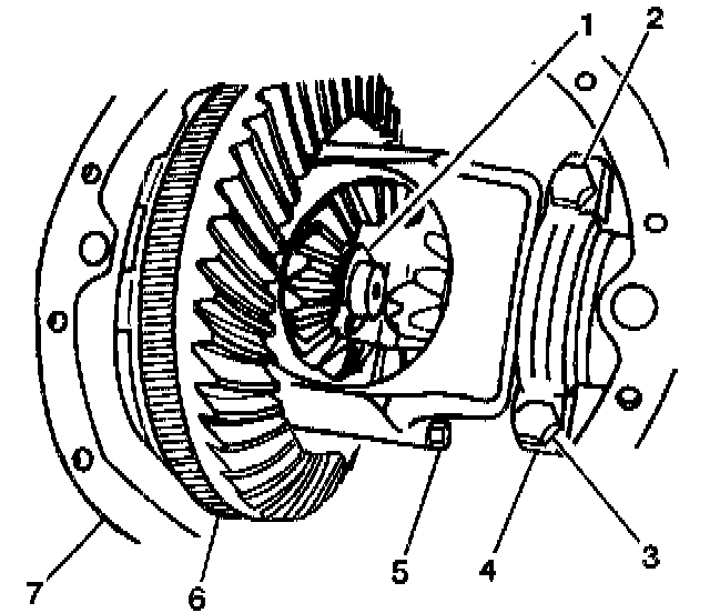 4. Thoroughly clean the threads of the pinion gear shaft lock bolt (5) and apply threadlocker, GM US P/N 12345382 Canada P/N 10953489 or equivalent to the bolt threads.