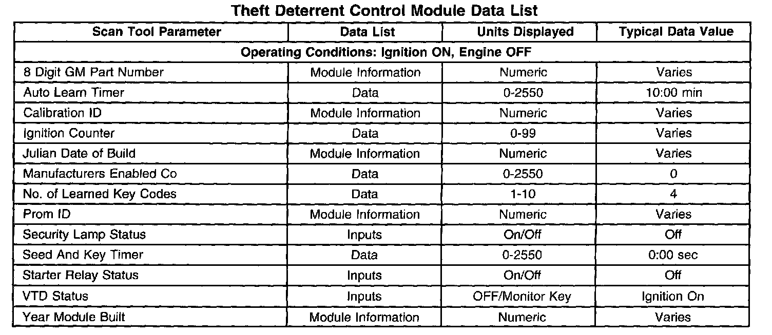 Theft Deterrent Control Module Data List
