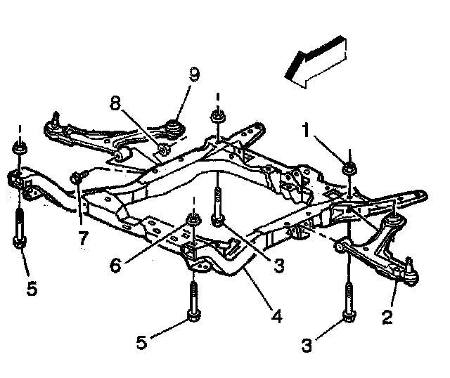 12. Loosen the front bolts (5) on the crossmember (4).