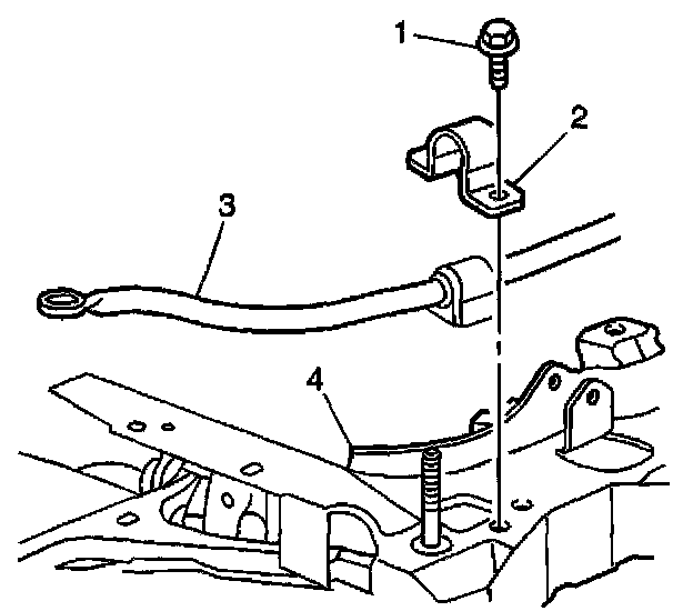 9. Remove the bolts (1) from the insulator brackets (2) attaching the stabilizer shaft (3) to the crossmember (4).