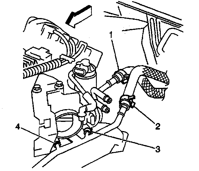 9. Remove the thermostat bypass pipe coolant hoses (3,4) from the throttle body.