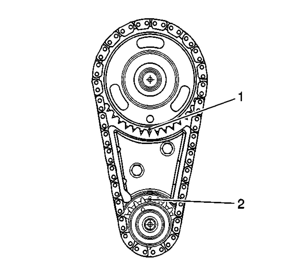 - The timing chain dampener to the camshaft sprocket locator hole (1).