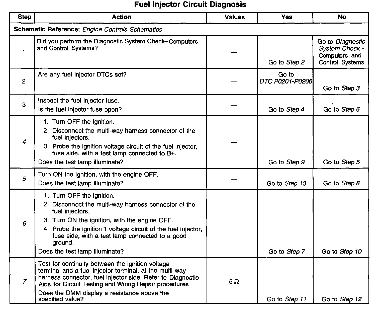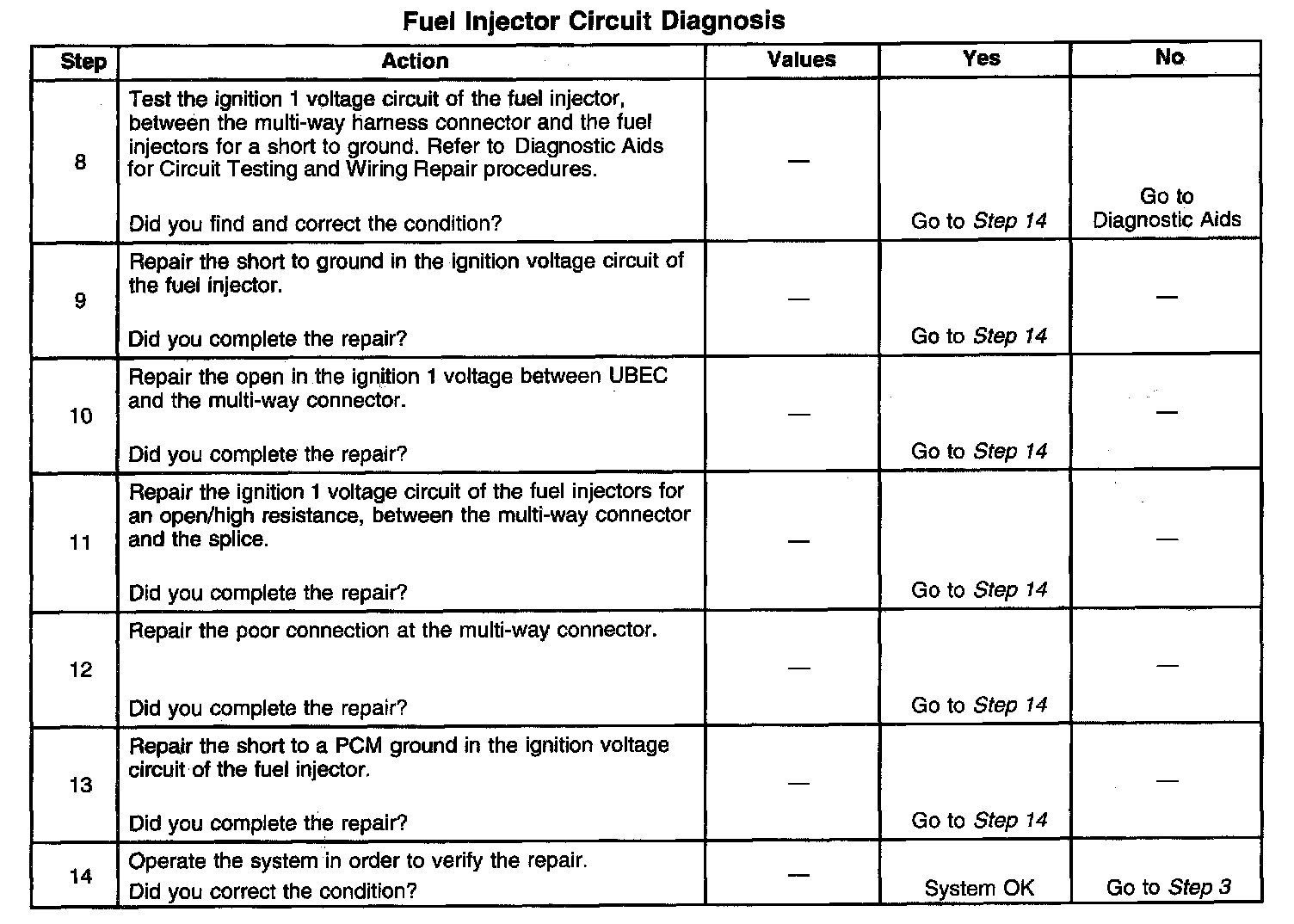 7. This step tests for an open or high resistance between the multi-way connector and the fuel injectors.