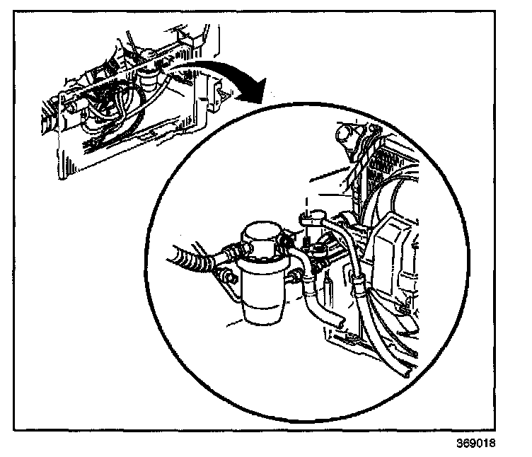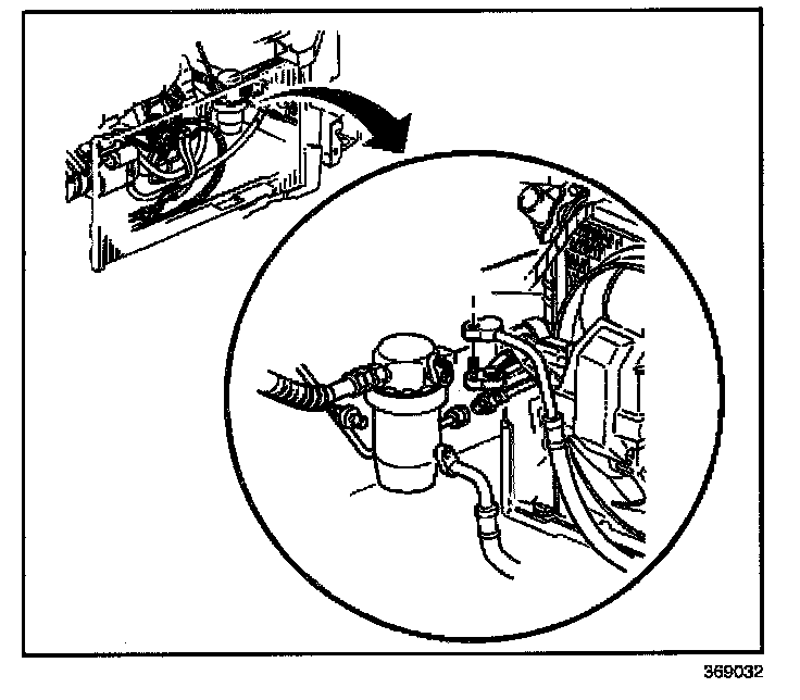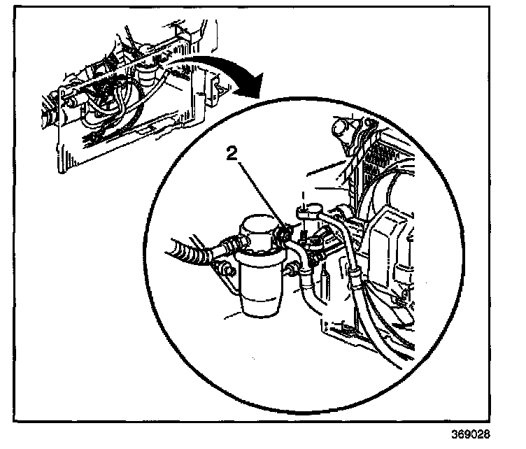 5. Remove the A/C compressor hose nut (2) from the accumulator.