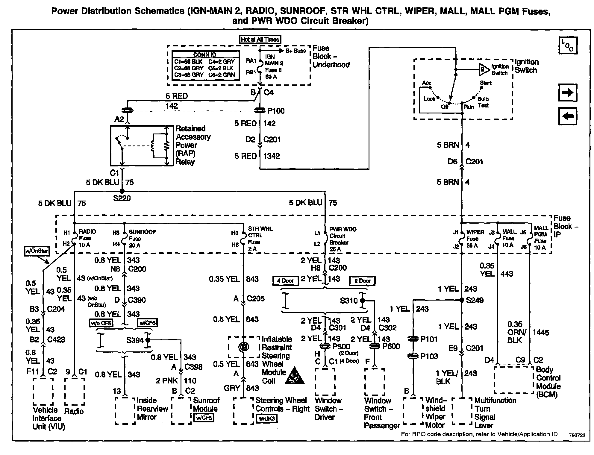 Power Distribution Schematics: IGN-MAIN 2, RADIO, SUNROOF, STR WHL CTRL, WIPER, MALL, MALL PGM Fuses, And PWR WDO Circuit Breaker: