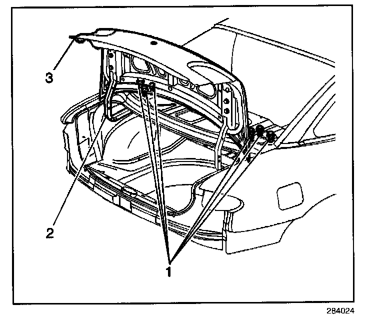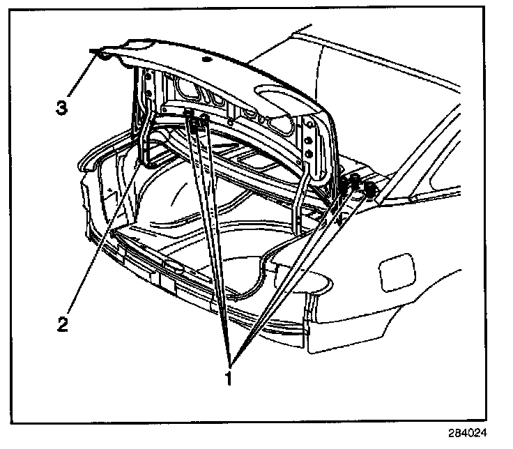 2. With an assistant install the hinge bolts (1) to the rear compartment lid (3).