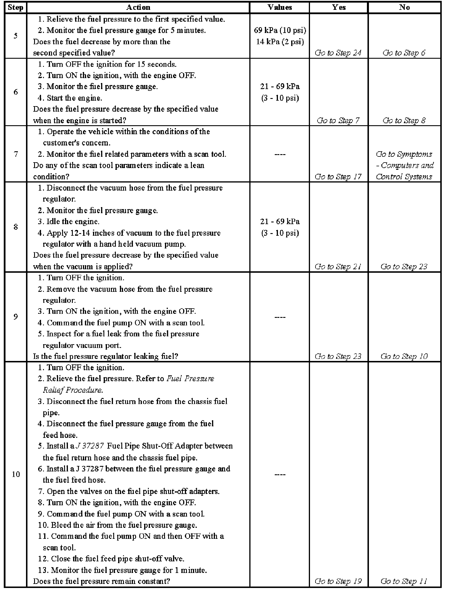 11. This step tests for a leaking fuel injector, or fuel pressure regulator. If the fuel pressure remains constant during this test, the fuel injectors are not leaking fuel.