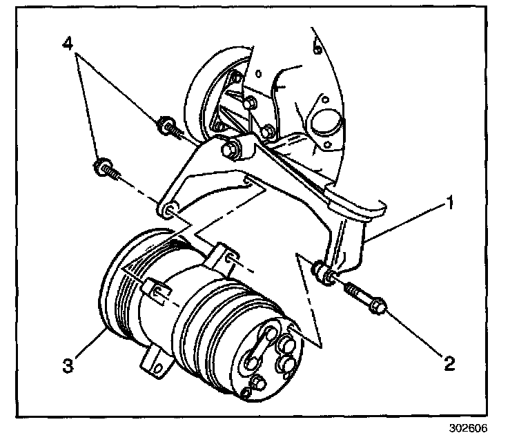 4. install the compressor mounting bolts (4, 2).