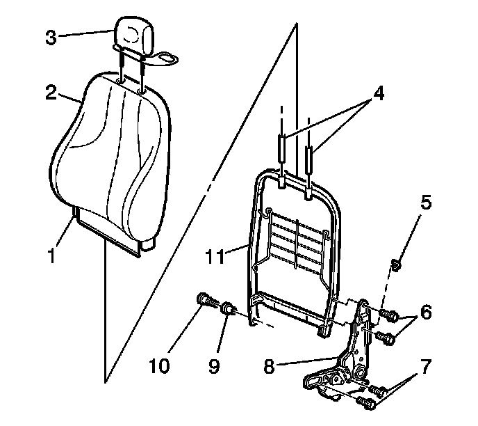 3. Remove the recliner bolts. Remove the recliner from the seat back frame (2).