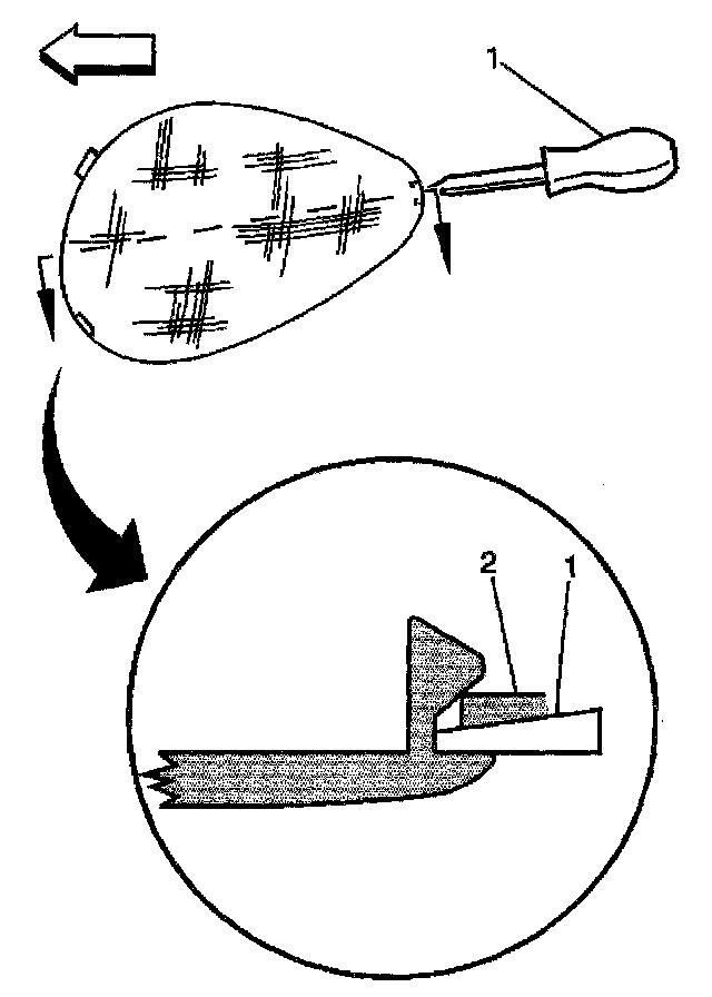 REMOVAL PROCEDURE1. From the rear of the dome lamp lens, insert a flat-bladed tool (1) between the dome lamp lens and the headliner (2).
