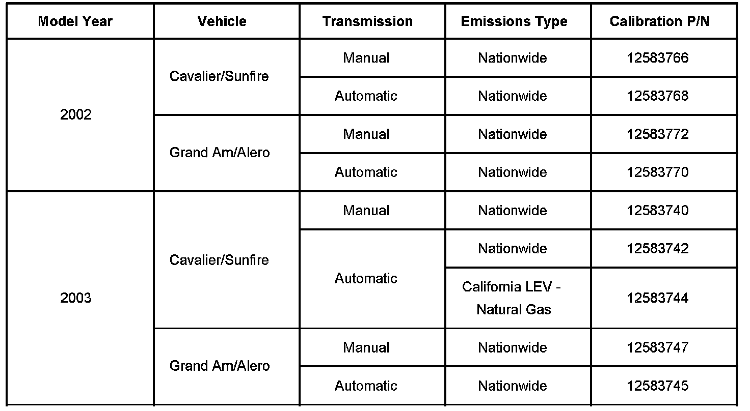 This bulletin provides information about installing new Powertrain Control Module (PCM) software and calibration on certain 2002-2003 vehicles equipped with 2.2L 4 cylinder engines. The revised calibration includes several OBD system improvements that should be installed as soon as practical. Install the new calibration on all affected vehicles identified in this bulletin, including vehicles in new dealer inventory and any vehicles that return for service, for any reason, during the applicable 8 year 80,000 mile (130,000 km) emission warranty coverage period. To verify if an updated calibration is required, refer to the following procedure in this bulletin.