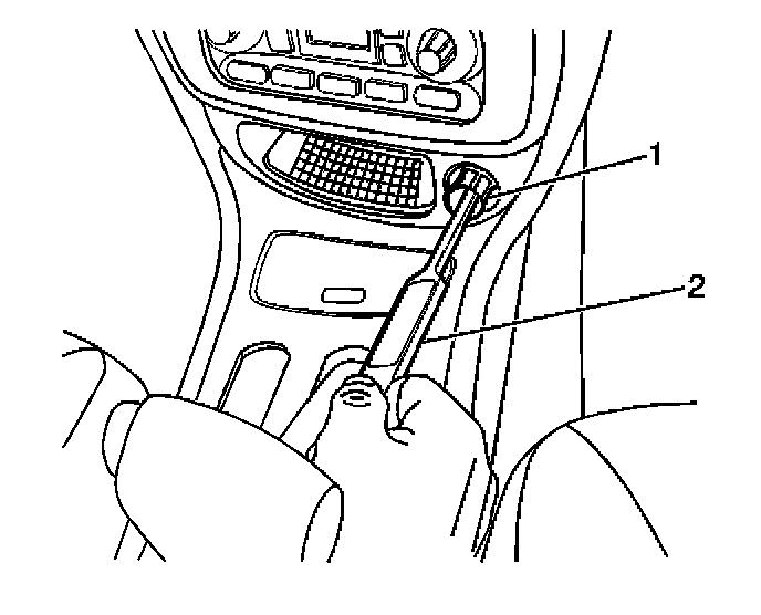 1. Use tool (2) J 42059 to engage the internal lock tabs and release the socket (1) out of the trim panel.