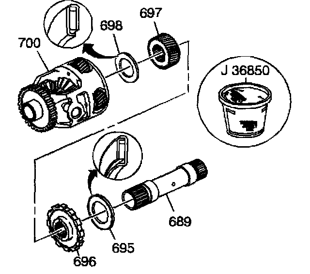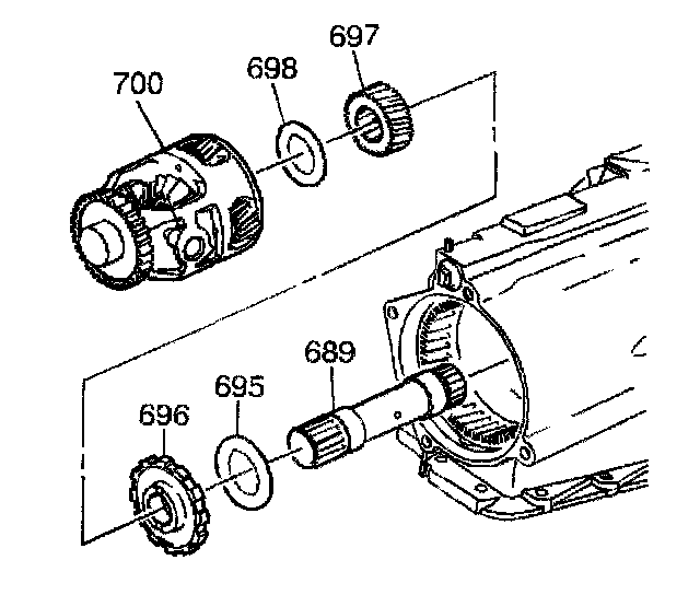 1. Assemble the sun gear thrust bearing (698), the differential carrier sun gear (697), the park gear (696), the internal gear thrust bearing (695) and the sun gear shaft (689) into the differential carrier (700).