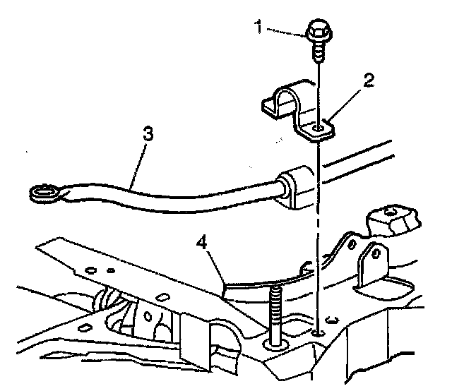9. Remove the bolts (1) from the insulator brackets (2) attaching the stabilizer shaft (3) to the crossmember (4).
