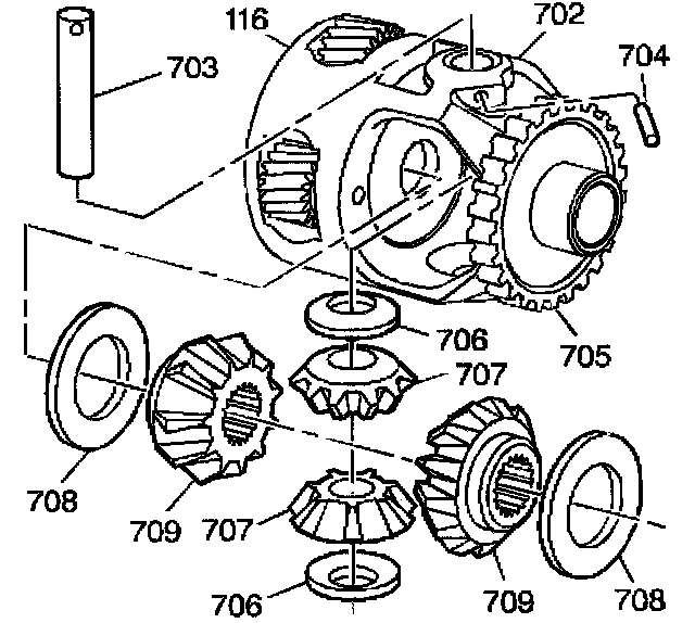 13. Rotate the pinion gears (707) into position, and install the pinion shaft (703) through the final drive carrier (116) and through the pinion gears (707).