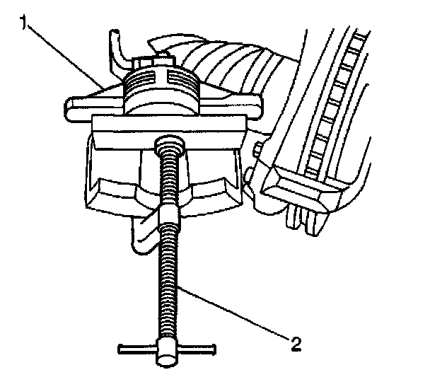 1. Bottom the piston into the caliper bore. Use an old brake pad or wooden block (2) across the face of the piston. Do not damage the piston or the caliper boot.