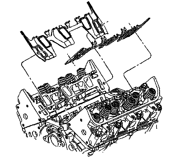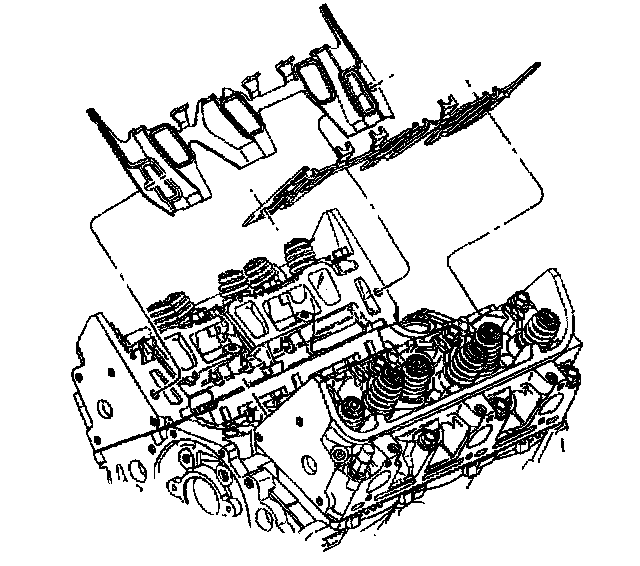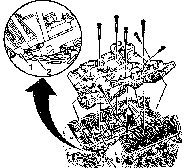 3. Apply a small drop 8 - 10 mm (0.31 - 0.39 inch) of RTV sealer GM P/N United States 12378479, GM P/N Canada 10953472, or equivalent to the four corners of the intake manifold to engine block joints (1).