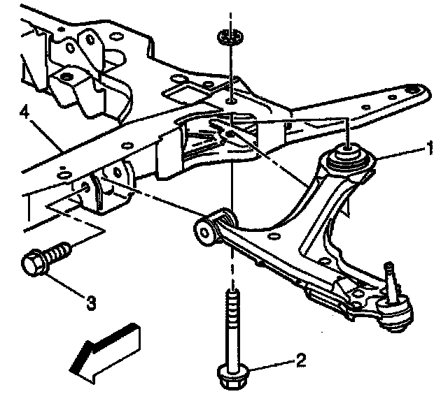 1. Install the control arm (1) into position and install the bolt (2) attaching the control arm (1) to the crossmember (4). Hand tighten the bolt.