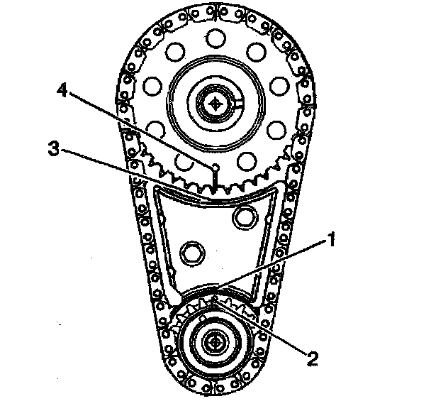 7. Align the timing mark on the camshaft gear (4) with the timing mark on top of the timing chain dampener (3).