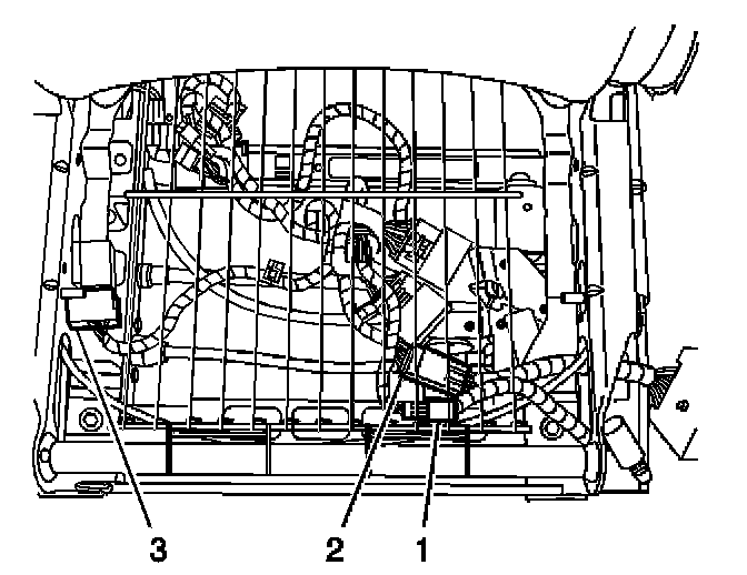 1. Remove the seat cushion trim cover and pad to expose the heater control module (3).