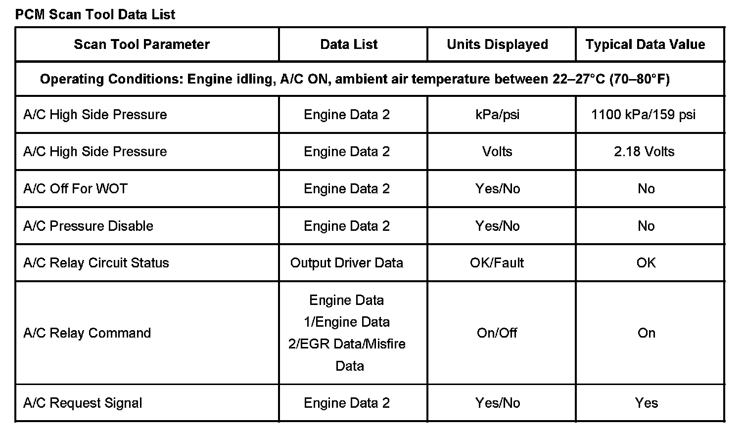 The scan tool data values were taken from a known good vehicle under the following conditions: