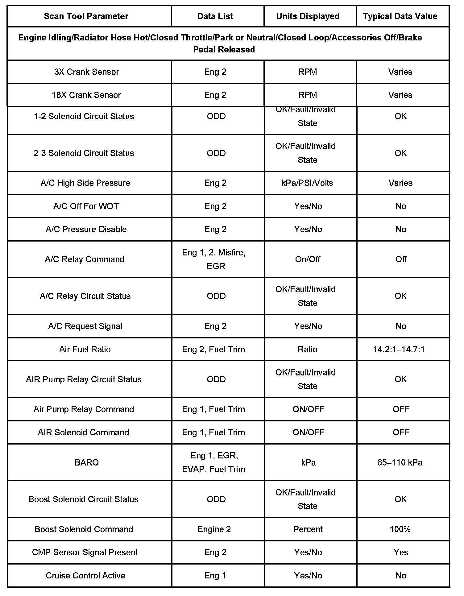 The Engine Scan Tool Data List contains all engine-related parameters that are available on the scan tool. The list is arranged in alphabetical order. A given parameter may appear in any one of the data lists, and in some cases may appear more than once, or in more than one data list in order to group certain related parameters together.