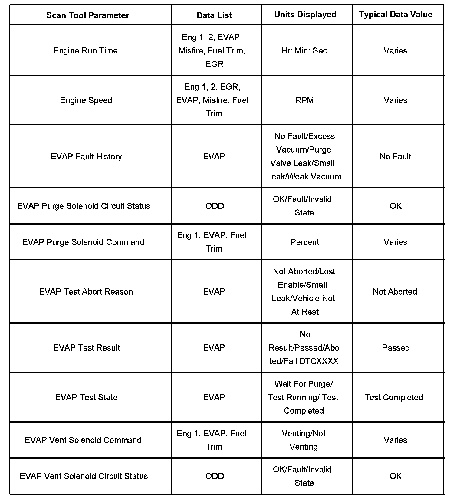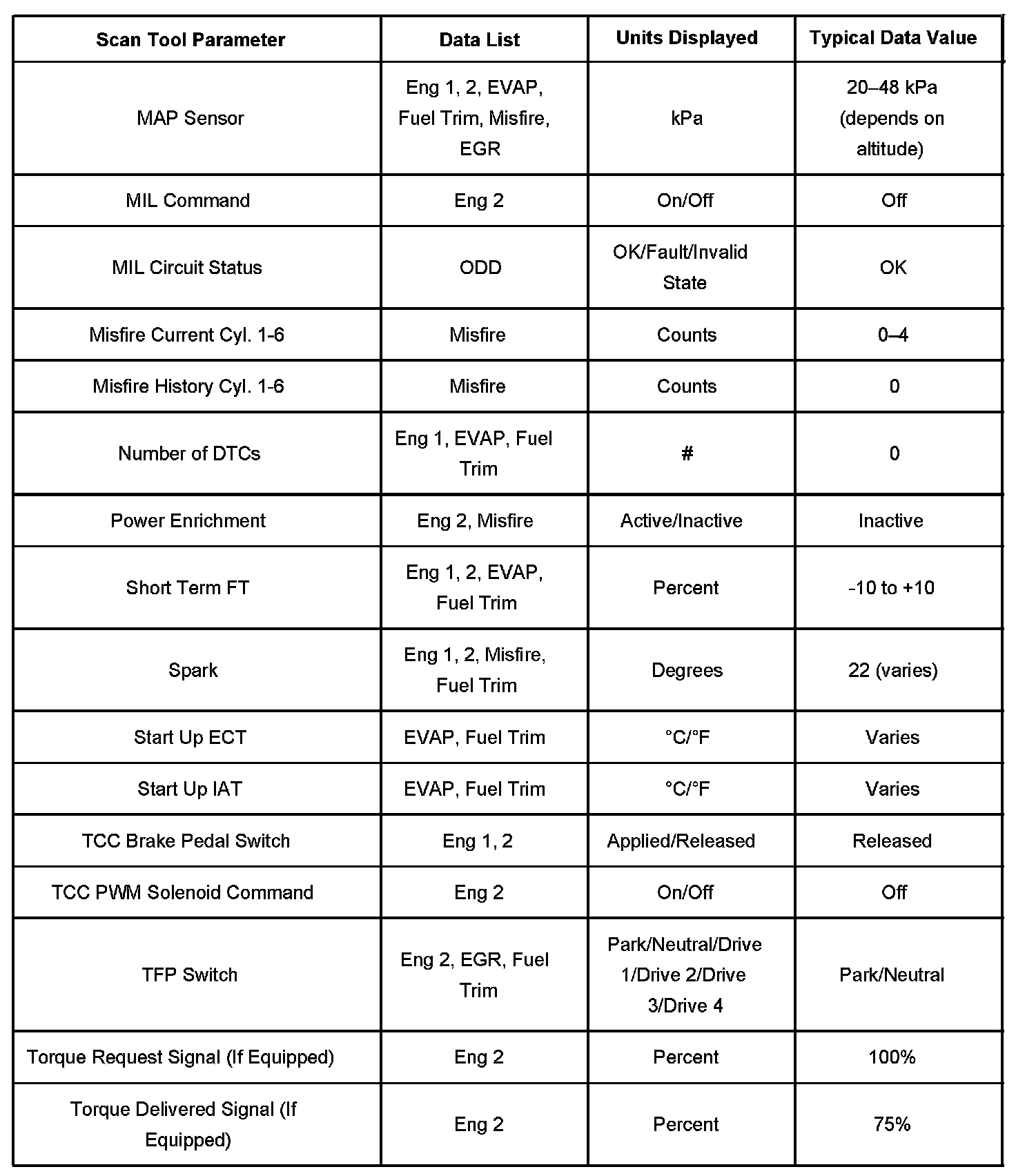 The column labeled Data List indicates where a parameter can be located on the scan tool. Refer to the scan tool operating manual for the exact locations of the data lists. The following is a description of each term listed: