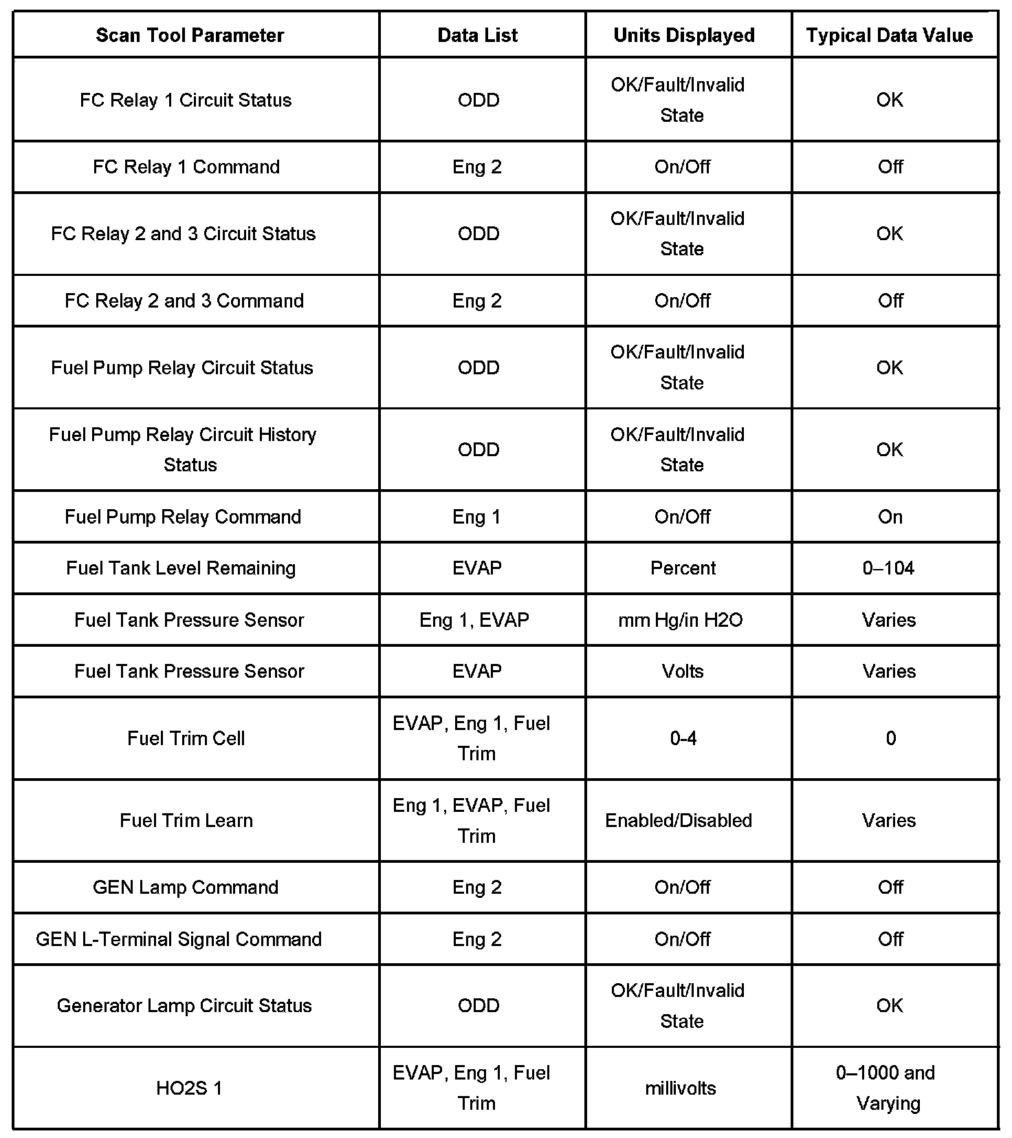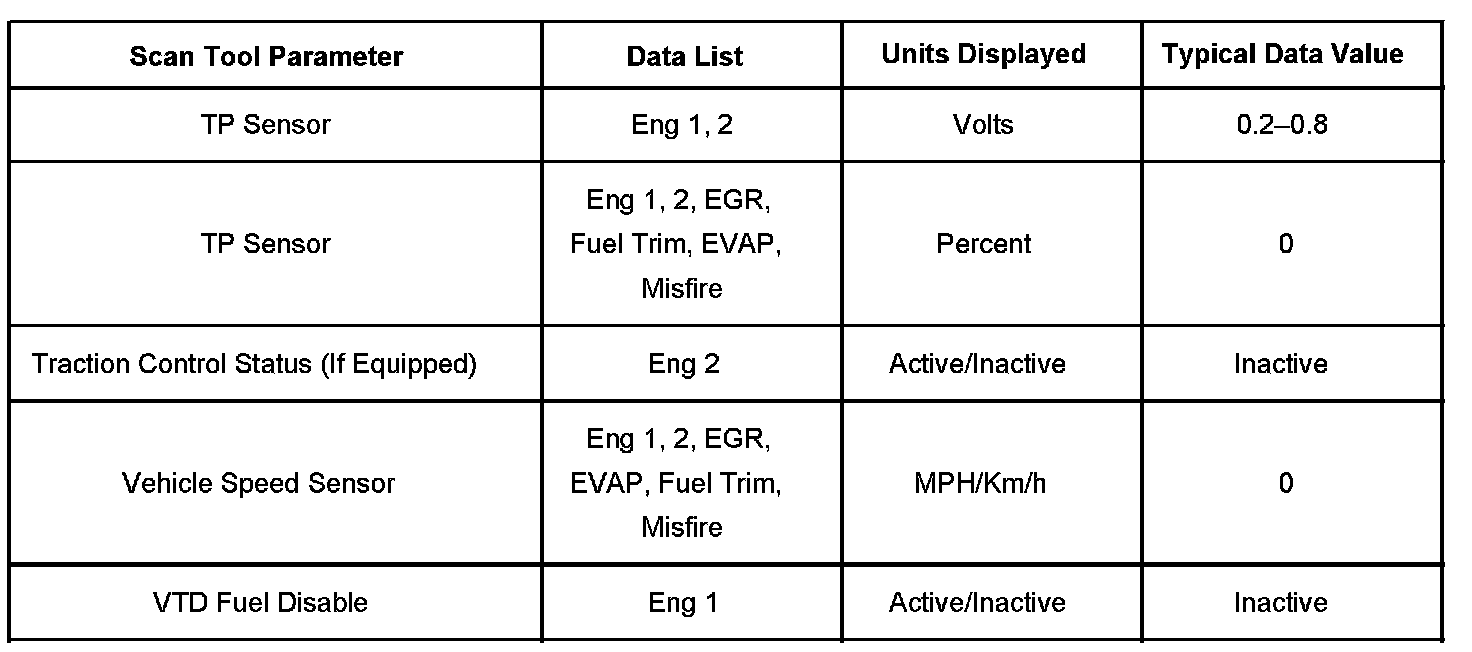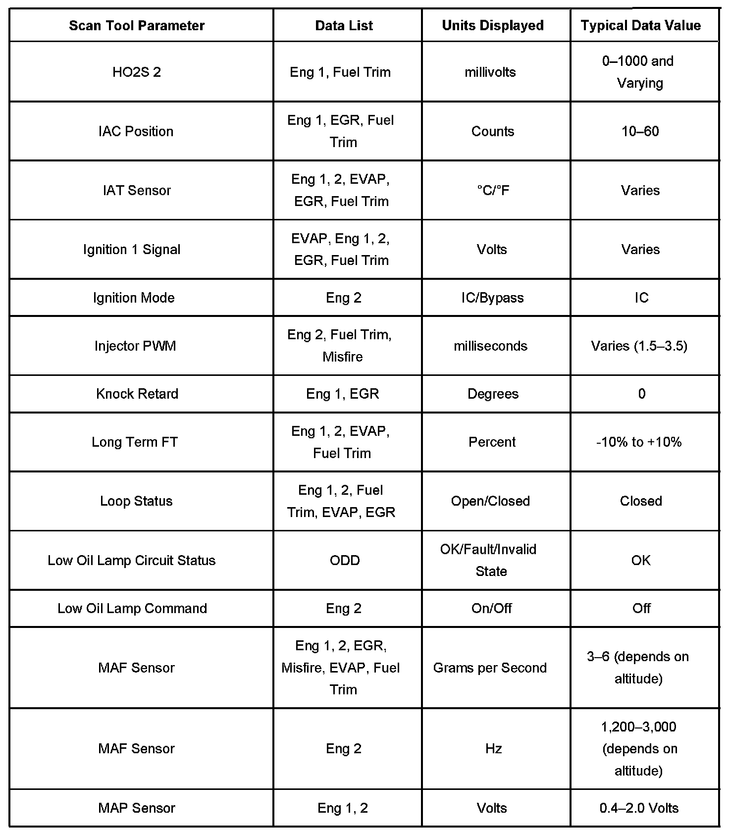 The scan tool values from a properly running engine may be used for comparison with the engine you are diagnosing. The Engine Scan Tool Data List represents values that would be seen on a normally running engine.
