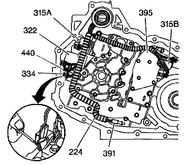 2. Use a small flat-bladed tool in order to remove the wiring harness from the solenoid valve (315A, 315B, 322, 334 and/or 440), TFP manual valve position switch (395) and the temperature sensor (391).