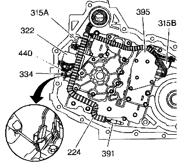 2. Install the wiring harness to the solenoid valve (31 5A, 31 5B, 322, 334 and/or 440), TFP manual valve position switch (395) and the temperature sensor (391).
