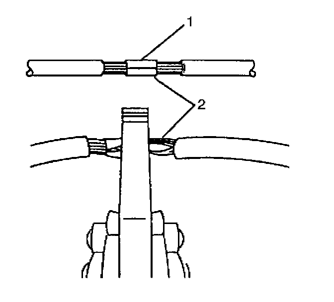 7. Center the splice clip (2) over the stripped wires (1) and hold the clip in place.