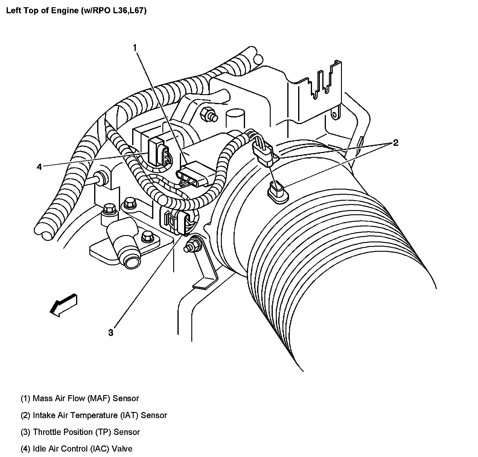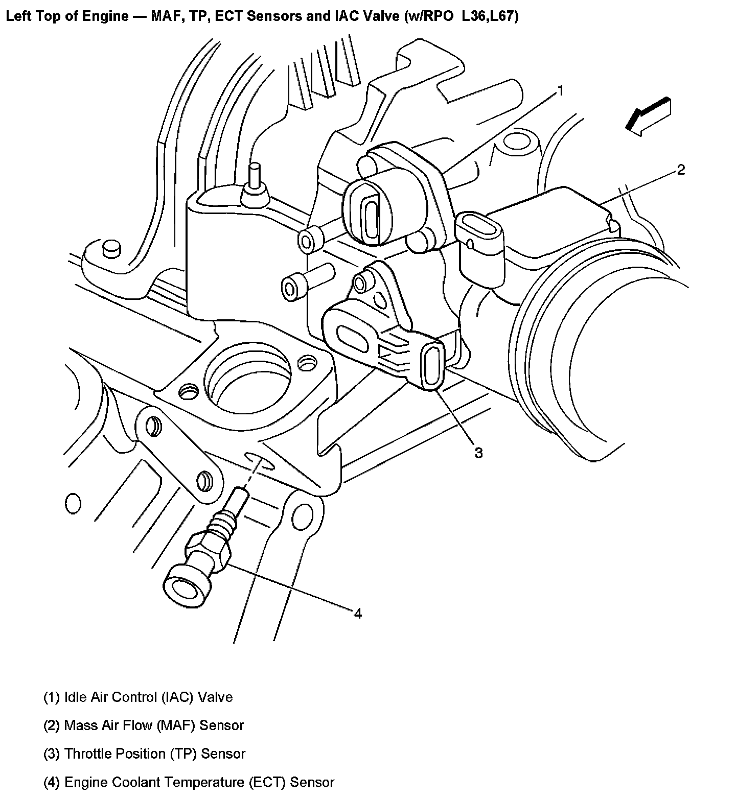 Left Top Of Engine - MAF, TP, ECT Sensors And IAC Valve: