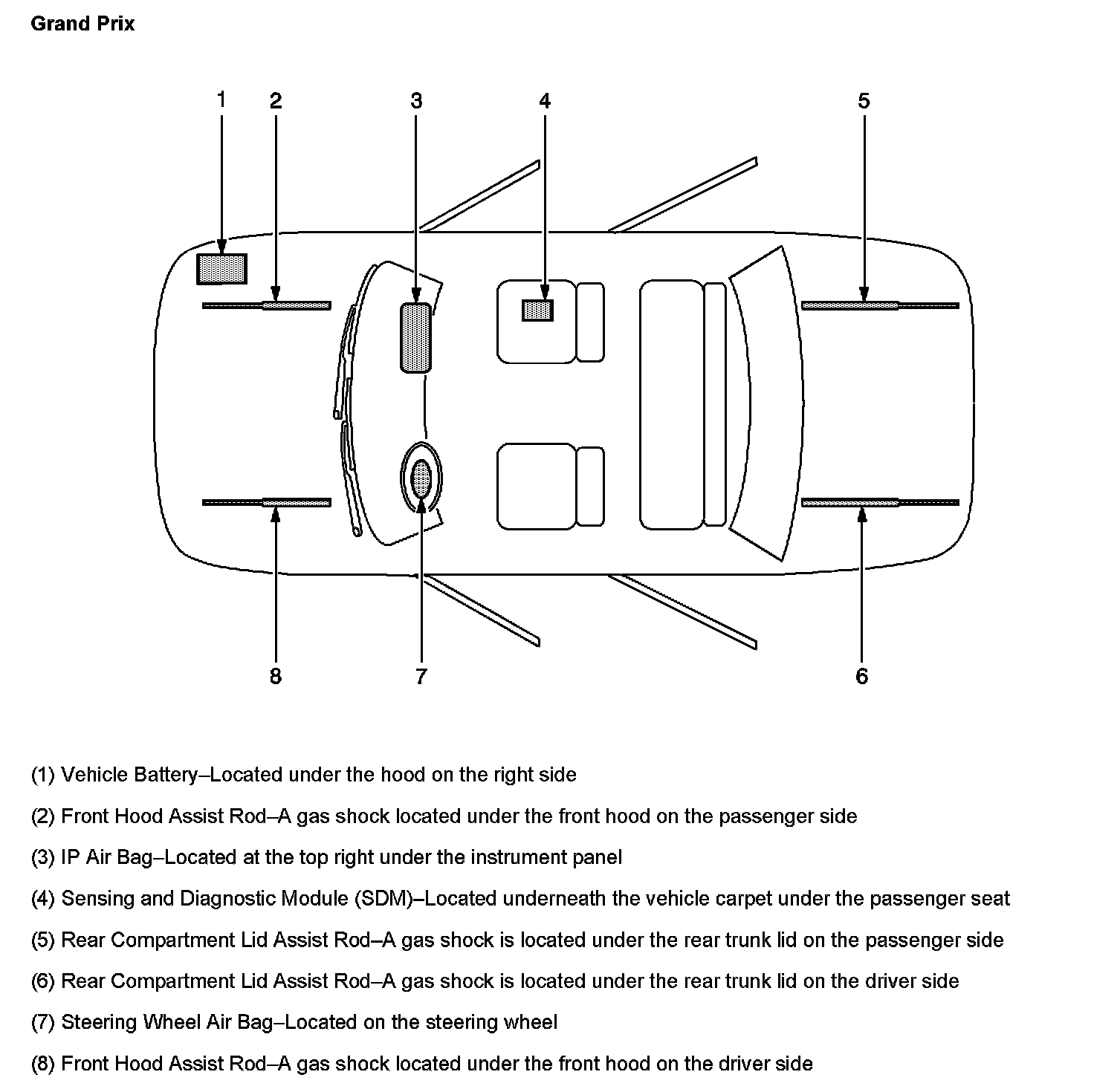 The SIR Zone Identification Views shown below illustrate the approximate location of all SIR components available for the vehicle. This will assist in determining the appropriate SIR Disabling and Enabling Zones for a given service procedure, refer to SIR Disabling and Enabling Zones.
