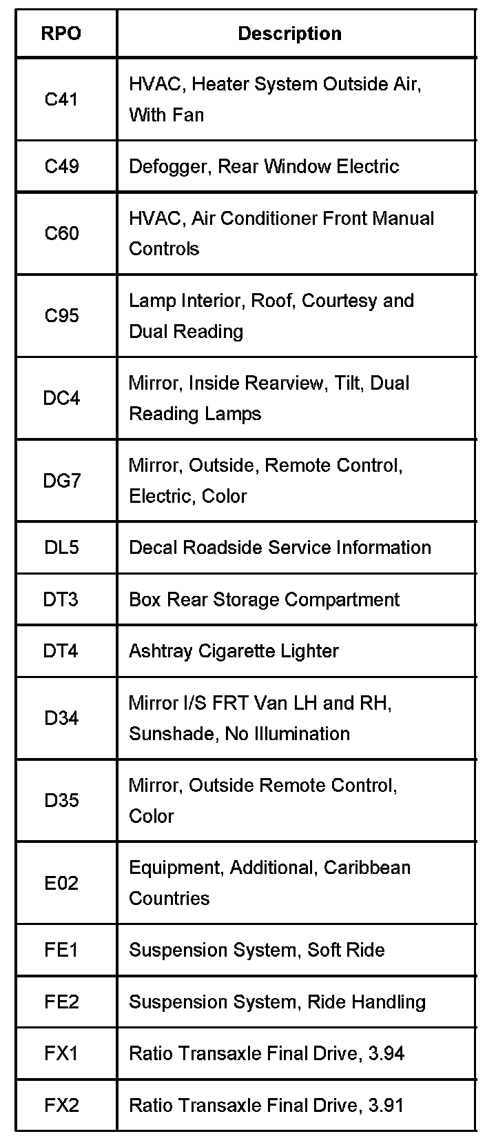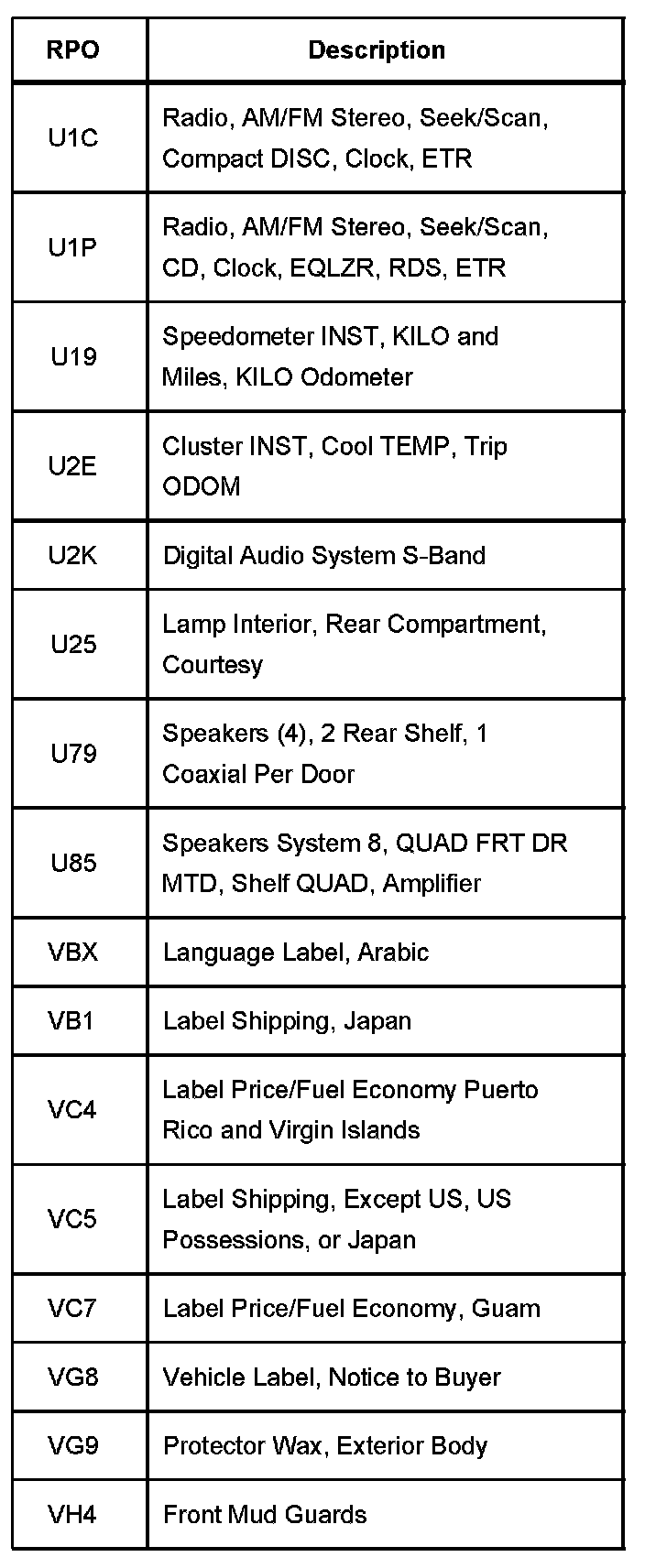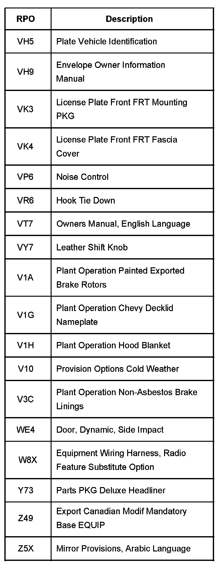 The production/process codes provide the description of the Regular Production Options (RPOs) used on the vehicle. The RPO list is printed on the Service Parts Identification Label. The following is a list of the RPO abbreviations and the description of each.