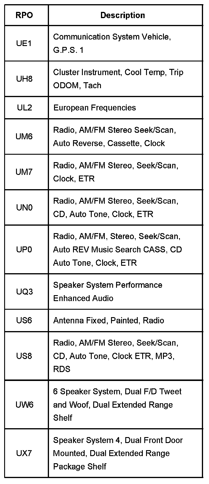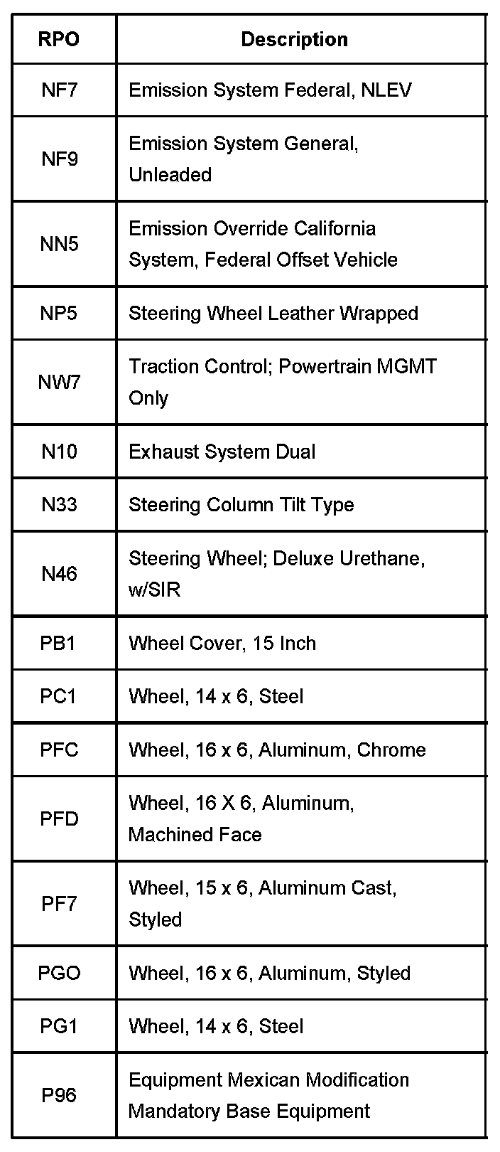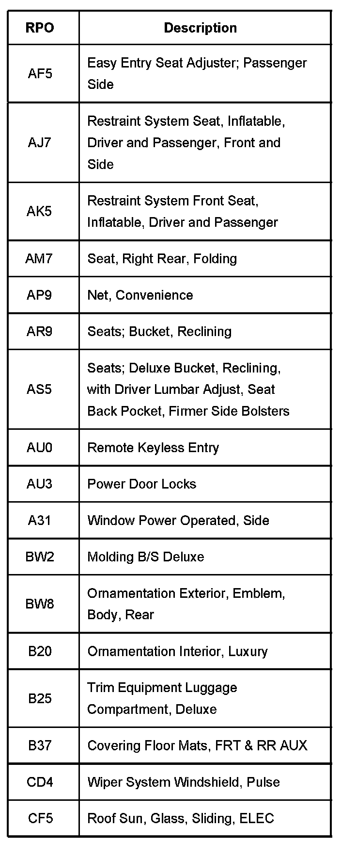 The production/process codes provide the description of the Regular Production Options (RPOs) used on the vehicle. The RPO list is printed on the Service Parts Identification Label. The following is a list of the RPO abbreviations and the description of each.