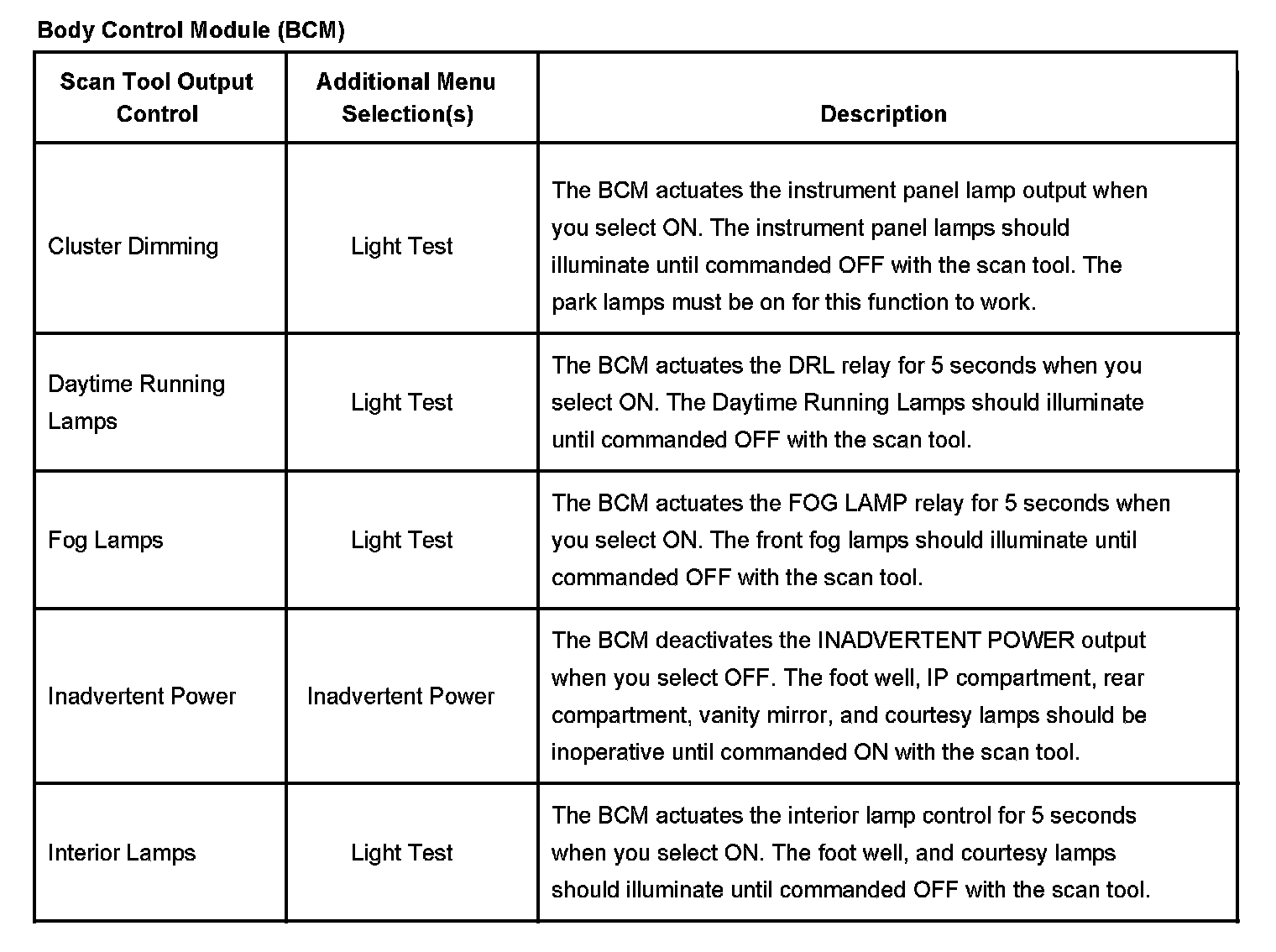 Body Control Module (BCM) Scan Tool Output Controls: