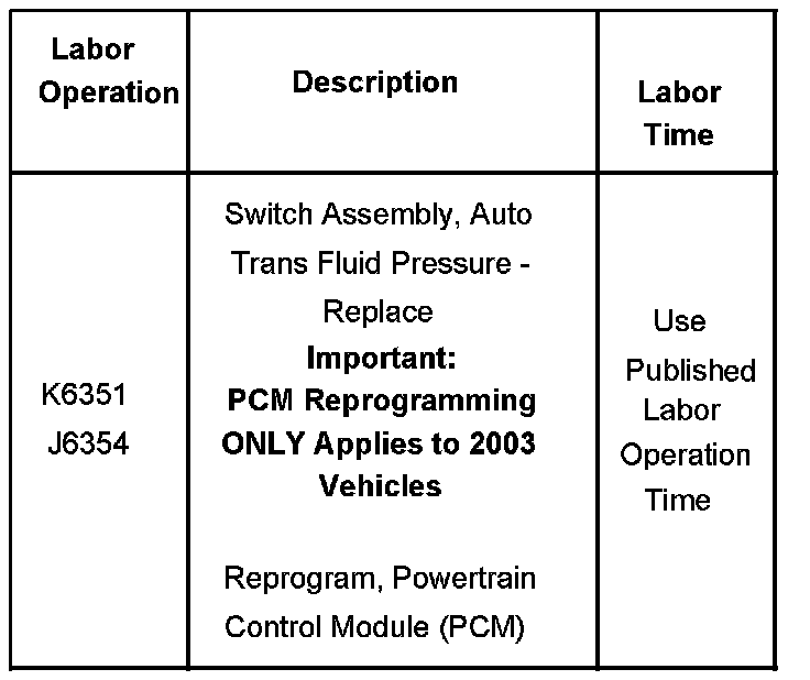 1. If servicing a 2003 Alero, Grand Am, or Malibu with a V6 (RPO LG8 or LA1) for a DTC P1815 built prior to the VIN Breakpoints listed in the table above, REPROGRAM the PCM with the calibrations listed, prior to replacing the TFP switch.