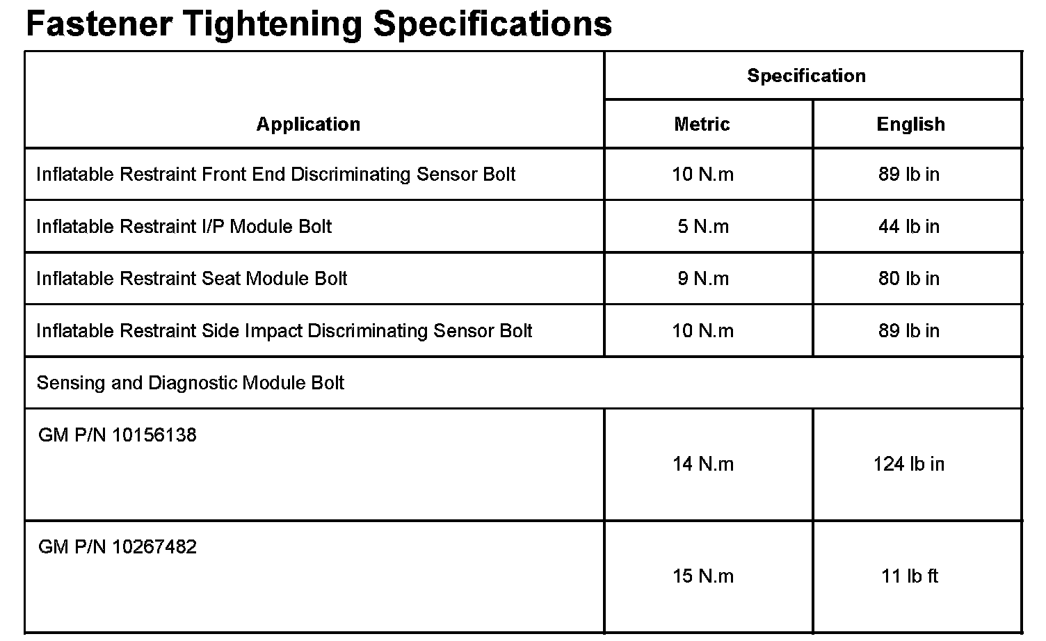 Fastener Tightening Specifications: