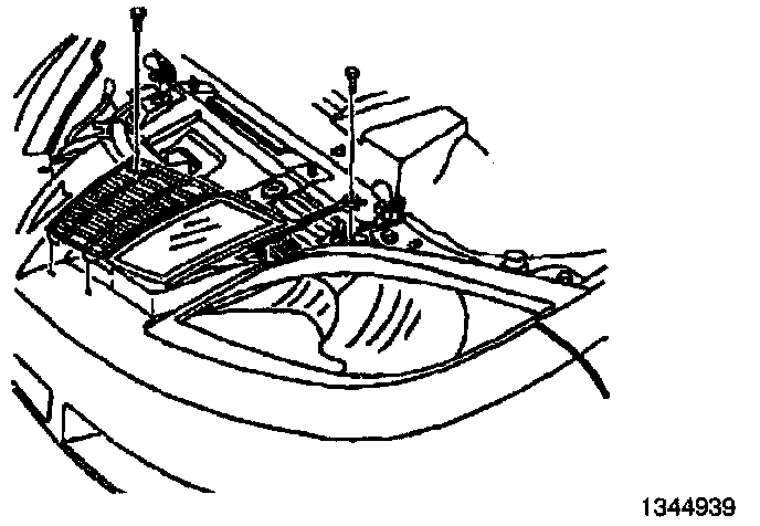 15. Remove the two 10 mm hex head bolts that attach the windshield washer reservoir to the body. The air duct will remain attached to the reservoir.