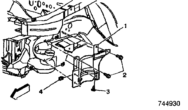 12. Remove the two 7 mm hex head screws (2) and one pushing retainer (3) that attach the engine splash shield (1) to the body.